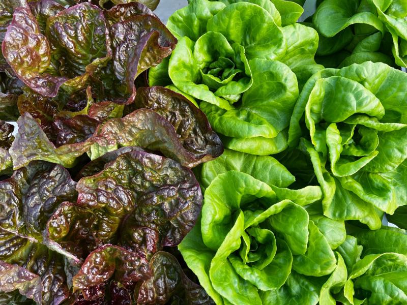 The subscription includes 2 heads of butterhead (Boston) lettuce, one each of a red and green variety, and a bundle of fresh arugula, kale, pak choi or spinach, depending on what is ready to harvest that week.