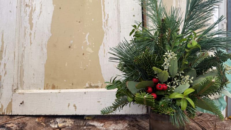 Create a tabletop-sized miniature Christmas tree out of an assortment of lush winter greens and embellishments. We give you everything you need to create your own design: fresh-cut winter greens, accessories, and container.