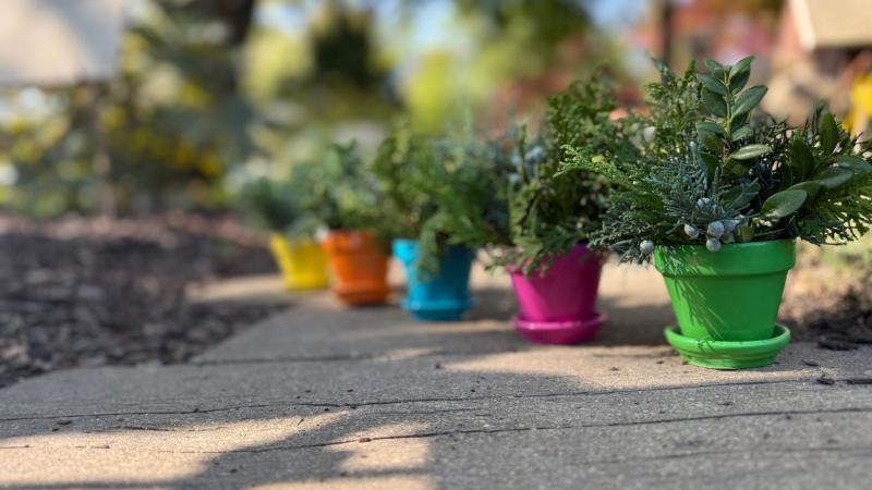 Kids and their parents can design their own mini pot of holiday greens with a touch of holiday sparkle. Just the right size for gifting or decorating their room.